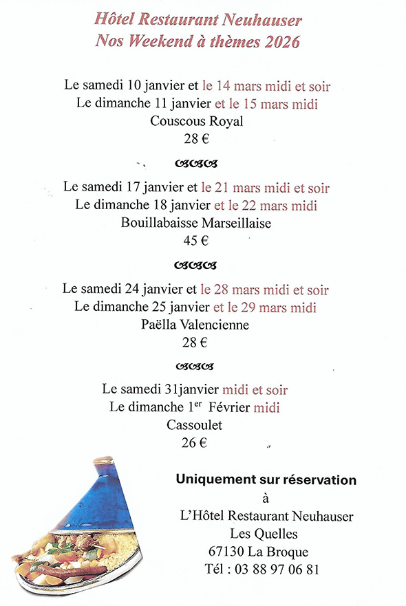 L'Hôtel-Restaurant Neuhauser ne garantit pas que ce site soit exempt de défaut, d'erreur ou d'omission. L'information qui y est contenue est destinée à vous apporter des indications générales et les mieux actualisées possibles sur les sujets traités. L'Hôtel-Restaurant Neuhauser ne saurait en aucun cas être tenue responsable des éventuels défauts, erreurs ou omissions existant dans ce site, ni de l'utilisation et de l'interprétation de l'information qu'il contient.